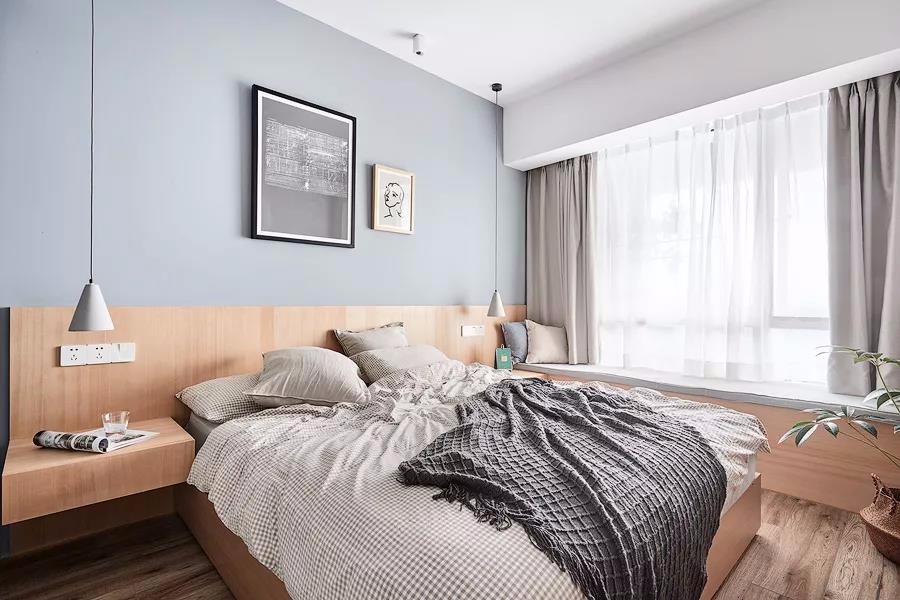 有2個臥室,還有1個小書房,布局真的很不錯。整個家大量搭配了原木家具,清新又自然,文藝又有格調,好喜歡這種休閑又放松的家居氛圍。很多人問我客廳刷什么顏色的乳膠漆好,我覺得淺灰色不錯,客廳采光特別的給力,好喜歡休閑飄窗的設計,視野十分開闊,看書休憩都特別的舒服。淺灰色調不會顯得過于沉穩,在布藝中加些暖色,會更顯休閑溫馨感。軟裝搭配細節放大看一看,哈哈,質感真的不錯,黃色抱枕真的超愛了!搭配個小邊幾,擺上綠植,清新又養眼,裝修的時候墻面別忘了預留插頭,平時充電會更方便些.主臥的采光也特別棒,整個空間氛圍清新又自然。很喜歡床頭木質護墻板的設計,和臥床、床頭柜融為一體,十分的協調。廚房雖然面積不大,但也打造出U型布局,動線合理,操作方便。很喜歡這種時尚中融入清新色調的搭配了。冰箱也有了歸屬感!
