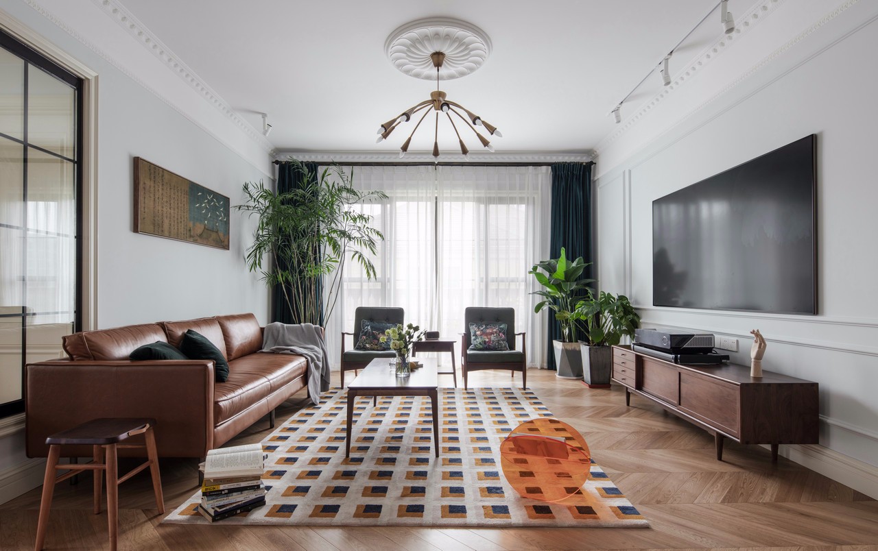 客廳大體是一家三口最長活動場所,這個區域我總體采用的功能性和美觀性結合的方式。 整體色調的統一:整體以胡桃實木的顏色做總色調,從胡桃實木的茶幾到胡桃木的電視柜,再到棕色調的真皮沙發,最后再是一塊長方形的大地毯,做幾個顏色(淺白+棕色+黑色)的重疊,與整個空間所有顏色進行呼應。房主很喜歡夏威椰,因為有竹的氣質,因此它別名也叫夏威夷竹子。濃綠的色彩,茂密的枝條,富有光澤的綠葉傳遞給人一種欣欣向榮的精神氣。它能通過呼吸微調節空氣環境,吸收房中甲醛等揮發性物質。從風水上來講,它放在柱子下面有去煞氣之說。