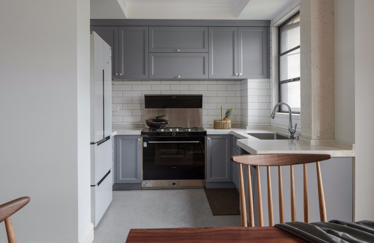 因廚房原來的面積本來就較小,為了改善這個問題,我們還是采用了開放式廚房。整個區域與餐廳區域結合,這里不做區隔,方便媽媽做菜的時候,可以和餐廳的人進行互動。 當然,開放式廚房,有一個小建議,因為炒菜油煙的問題,建議購買大功率吸油煙機。房東買的集成灶,既節省空間,也方便使用。因為收納空間足夠,所以平常不使用的時候,臺面也可以保持整潔如新。