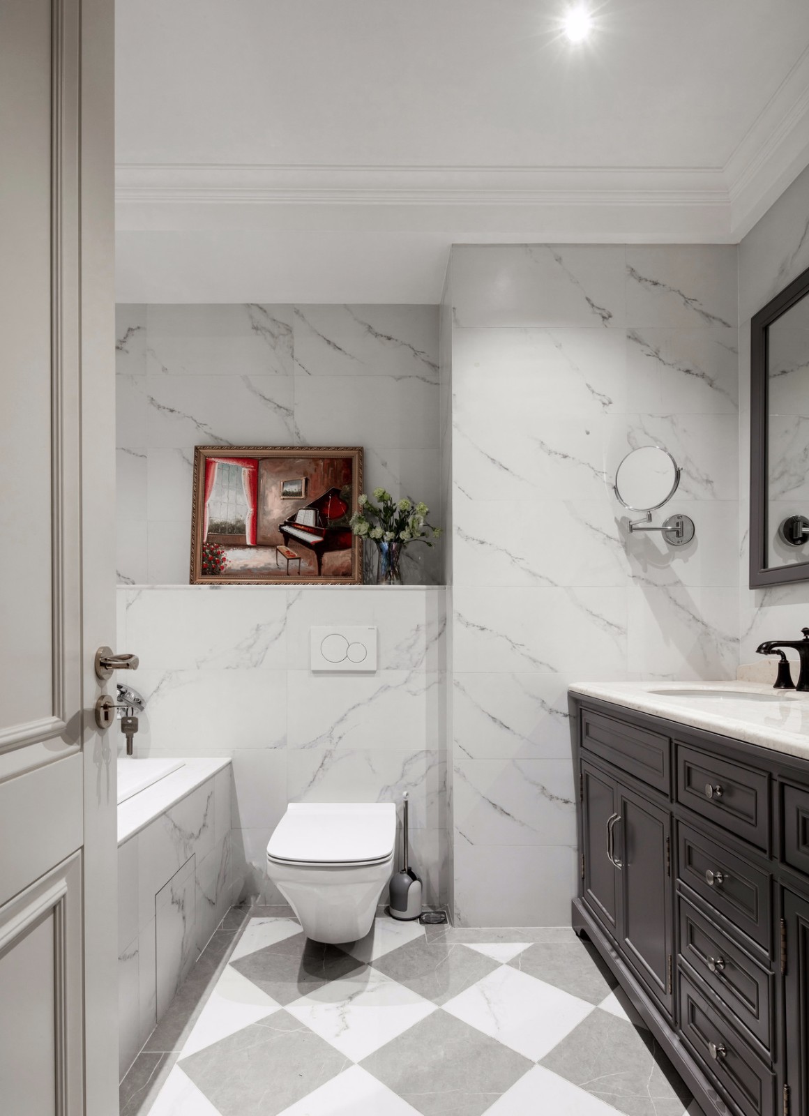 主臥的衛生間滿足了房東的要求,浴缸+梳洗臺+儲物柜+馬桶全部都有。因為在主臥,可以滿足泡澡需求而不被打擾,大概牙醫日常用來放松的場所。 墻面和浴缸表面均采用同樣花紋大理石,不規則的灰色紋路隨意點綴,任意而妄為;地上的大理石采用菱形灰白大理石,與墻體做呼應。墻上的裝飾畫,我個人很喜歡,使整個使用空間格調迅速提高。