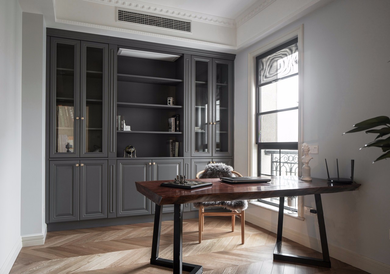 書房空間開放之后,光線充足,空間自由,全實木材質的定制書桌書架,搭配原木色的椅子,十分有質感。 這大概是房東的私人空間,墻面的部分做了櫥柜,方便擱置書籍和小禮物的地方。顏色調性和廚房櫥柜保持了一致。 書桌買了簡易型又文藝的桌子,甚至它可以搖身一變,變成茶室(自行想象)??拷皯舻奈恢?,也是為了采光較好,方便閱讀和思考。有時候頭腦需要休息的時候,還可以向著窗外吹吹風,發發呆。