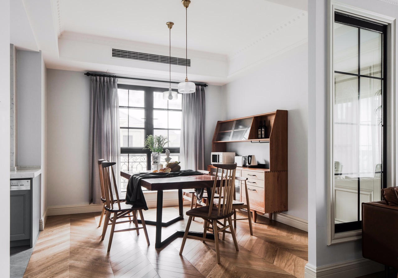 因日常只有三人食用,菜品不會很多,偶爾會有父母做客,滿足房主想要的長行餐桌(正好滿足五人食用,空間不會擁擠) 餐桌后面我又放置了一個儲物柜,色調與餐桌一致,兼顧了美感和平衡感??梢苑胖煤芏鄰N房放不下的東西(滿足房主喜歡東西擺放整齊的要求)